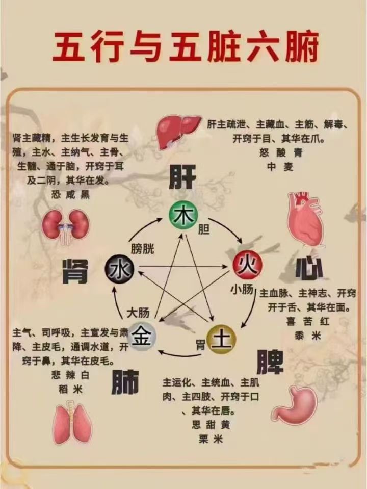 五行与五脏六腑是中医理论中的重要组成部分,它们之间存在着密切的联系。下面是五行与五脏六腑的对应关系以及它们的基本功能: 1. 木 - 肝(肝脏) 功能:疏泄、藏血、主筋、解毒。 情绪:怒。 颜色:青。 味道:酸。 季节:春。 2. 火 - 心(心脏) 功能:主血脉、神志。 情绪:喜。 颜色:赤。 味道:苦。 季节:夏。 3. 土 - 脾(脾脏) 功能:运化水谷、统血、主肌肉、四肢。 情绪:思。 颜色:黄。 味道:甘。 季节:长夏。 4. 金 - 肺(肺脏) 功能:主气、呼吸、宣发与肃降、通调水道。 情绪:悲。 颜色:白。 味道:辛。 季节:秋。 5. 水 - 肾(肾脏) 功能:藏精、主生长发育与生殖、主水、纳气、主骨、生髓、通于脑。 情绪:恐。 颜色:黑。 味道:咸。 季节:冬。 六腑指的是胆、胃、小肠、大肠、膀胱、三焦,它们与五脏相互配合,共同完成人体的生理功能。例如: 胆:与肝相表里,负责储存和排泄胆汁。 胃:与脾相表里,负责受纳和腐熟水谷。 小肠:与心相表里,负责分别清浊。 大肠:与肺相表里,负责传导和排泄。 膀胱:与肾相表里,负责储存和排泄尿液。 三焦:是六腑中的特殊概念,负责协调其他腑脏的功能。 五行理论认为,五行之间存在相生相克的关系,这种关系也体现在五脏六腑的功能和相互影响上。通过调和五行,可以达到身体健康和预防疾病的目的。
